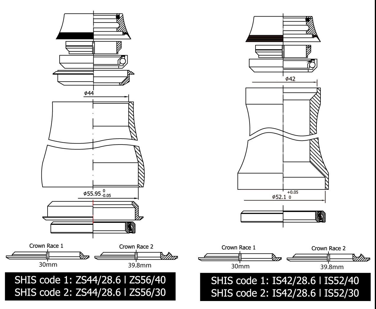 Le choix se fait en fonction de la hauteur du tube de direction de la fourche (30mm /39.8mm) et de la demande (IS42 / IS52 / ZS44 / ZS56) pour compléter l'ensemble.