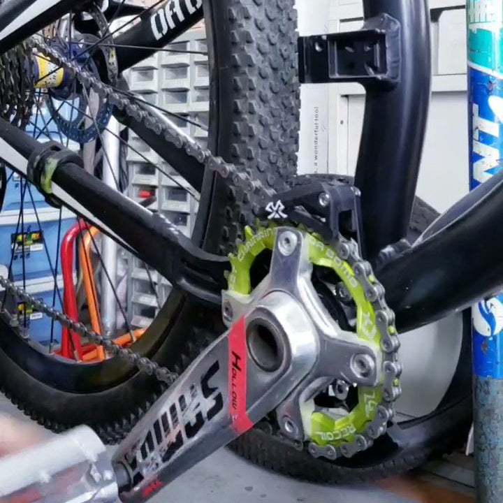 Le pare-chocs robuste est capable de résister aux chocs. Le rouleau inférieur amovible sert de tendeur de chaîne.